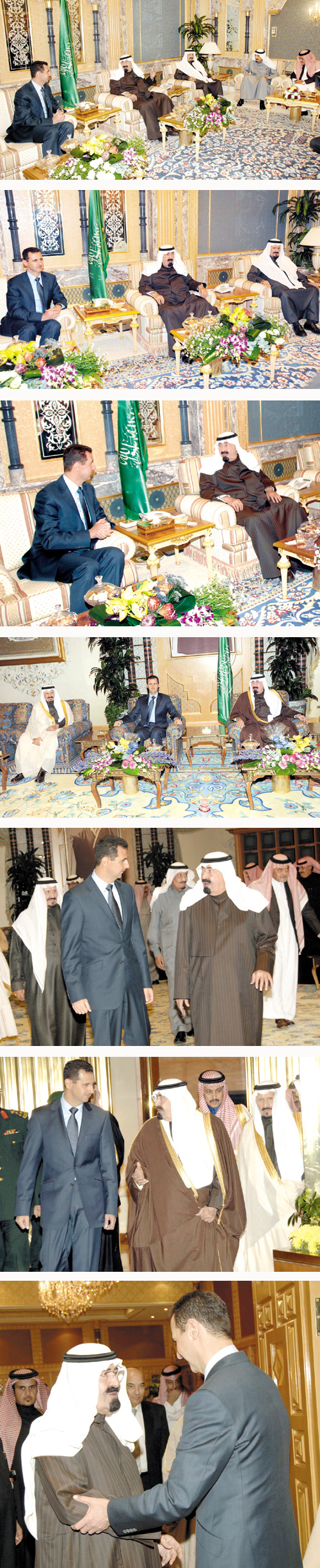 عقد خادم الحرمين الشريفين الملك عبدالله بن عبدالعزيز آل سعود وأخوه فخامة الرئيس الدكتور بشار الأسد رئيس الجمهورية العربية السورية اجتماعاً في مزرعة خادم الحرمين الشريفين بالجنادرية مساء أمس، وجرى خلال الاجتماع بحث مجمل الأوضاع على الساحة العربية وفي مقدمتها تطورات القضية