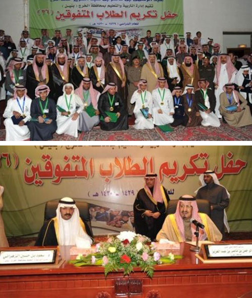 ثم قدَّم مدير التربية والتعليم بالمحافظة لصاحب السمو الملكي الأمير سلمان بن عبدالعزيز أمير منطقة الرياض ولسموه حقيبتين تحتويان على إنجازات الإدارة للعام المنصرم.. بعد ذلك تم تكريم المدارس المتميزة في الأسبوع التمهيدي والتهيئة الإرشادية .
