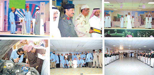 رعى صاحب السمو الأمير اللواء الركن بندر بن عبدالله بن تركي آل سعود مدير إدارة الثقافة والتعليم للقوات المسلحة الحفل الختامي للبرنامج التدريبي المهني (شباب اليوم.. صناع الغد) والمقام بمدارس الأبناء بقيادة منطقة الخرج الذي نظمه قسم الثقافة والتعليم بالقيادة، بالتعاون مع المعهد المهني الصناعي بالخرج بحضور قائد المنطقة اللواء الركن فهد بن عبدالله القحطاني ومدير إدارة التربية والتعليم بمحافظة الخرج الدكتور سعود بن حسين الزهراني، ومدير قاعدة الإمدادات والتموين اللواء الركن محمد بن علي حنبص ومدير قسم الثقافة والتعليم بقيادة منطقة الخرج الأستاذ محمد بن شايع المطرفي، ومدير المعهد المهني الصناعي المهندس سمير بن عبدالله العسكر، حيث استقبلت الفرقة الكشفية بالمدرسة الجميع بطابور عرض رائع نال استحسان الجميع، بعد ذلك اطلع سموه ومرافقوه بإيجاز لما قدمه المدربون المهندسون للطلاب خلال البرنامج الذي اشتمل على الأقسام والورش التالية: (قسم النجارة - قسم صيانة الحاسب - قسم الميكانيكا - قسم الكهرباء - قسم التبريد) اجتاز هذا البرنامج واستفاد منه طلاب مدارس الأبناء وطلاب الثانويات المشاركة (ثانوية الملك عبدالله - ثانوية السلمية - ثانوية ابن عثيمين - ثانوية ابن العميد - ثانوية اليمامة)، حيث بلغ عدد الطلاب المشاركين (132) طالباً تدربوا بواقع تسع ساعات تدريبية خلال ثلاثة أيام. بعد ذلك بدئ الحفل بالقرآن الكريم، ثم كلمة مدير قسم الثقافة والتعليم بقاعدة الخرج حيث رحب فيها بالجميع منوهاً بدعم سمو الأمير بندر ودعم قائد المنطقة لقسم الثقافة والتعليم بالخرج ومدارس الأبناء, تلا ذلك نشيد ترحيبي قدمه طلاب المدارس، ثم كلمة مدير المعهد المهني الصناعي, ثم مشهد مسرحي، لطلاب المرحلة المتوسطة بالمدرسة بعنوان (من قال الشغل عيب؟), ثم عرض بالبرجكتور عن فعاليات البرنامج.