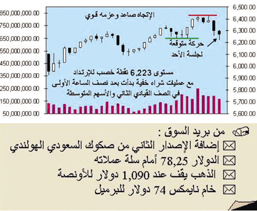 جلسة الأحد فيها استمرار لتوسع نطاق التذبذب بحوالي 60 نقطة مع نشاط ملحوظ في أسهم المضاربة خصوصاً أن الأسواق مغلقة الآن، وبشأن قطاع المصارف ضروري متابعة مستوى 16.355 نقطة نظرا لحساسيتها حيث كانت مقاومة وهي عودة للاختبار، أما بخصوص سابك طالما تجارها بعيدين عن مستوى 84 ريالاً فهي تعطيهم مجال أكبر للمناورة، وبعد دمج حركة التداول لآخر 32 جلسة يتوقع أن يغلق السوق عند 6.269 نقطة بعد زيارة لمستوى 6.223 نقطة وهي منطقة خصبة يترصد لها المشترون.