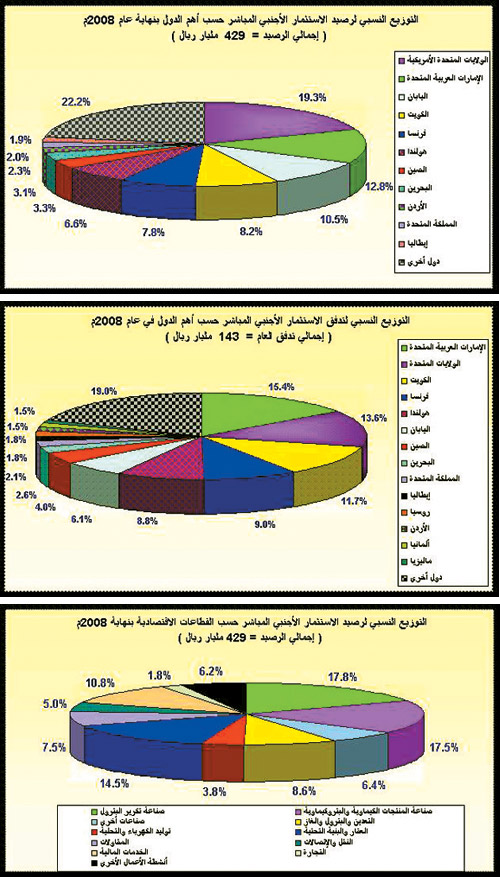 وبدأت تدفقات الاستثمارات الأجنبية المباشرة الداخلة إلى المملكة في الصعود بصورة ملموسة ابتداء من عام 2005م، ولكنها ارتفعت بصورة واضحة خلال عامي 2006م، و2007م حيث بلغت (68.6) (91)، على التوالي. ومواصلة للنجاحات التي تحققت في عامي 2006، 2007م، تمكنت المملكة من جذب المزيد من الاستثمارات الأجنبية المباشرة في عام 2007، حيث بلغ مجموع التدفقات الاستثمارية الأجنبية الداخلة 143 مليار ريال. مرتفعة بحوالي 57% من حجم التدفقات المباشرة لعام 2007م. وقد أدى صافي التدفقات الداخلة إلى ارتفاع إجمالي رصيد الاستثمارات الأجنبية في المملكة إلى 429 مليار ريال بنهاية عام 2008م.