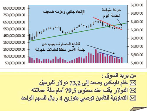 حل شهر فبراير على سوق الأسهم التي استقبلته بصمت حيث كانت حركته بطيئة في الجلسة وداخل نطاق تذبذب ضيق جداً حتى الإغلاق لم ينقص عن جلسة الأحد إلا بتسع نقاط ولا تزال قوى البيع والشراء متوازنة طالما بقي السوق فوق مستوى 6.223 نقطة وهي أهم دعومه القريبة، أما أحجام التداول كانت تحمل نفس الصفة حيث كانت ضئيلة جدا (105 مليون سهم) بسبب تغيب قطاع المصارف عن هذه الجلسة الذي لم يحقق سوى 26 مليون سهم وهي ضعيفة أيضاً، وبذلك يصبح الاتجاه وفق الرسم البياني جانبي وذو عزم ضعيف لا يرجح أن يدوم طويلا على المدى القصير (بضعة أيام)، أما بشأن سابك أغلق عند 85.75 ريالاً وتمثل أقرب الدعوم له (84 ريالا) ولا يعاني قطاع البتروكيماويات من أية مشاكل فنية لكن جميل جدا أن نرى قطاع المصارف يتداول ويتحرك فوق حاجز 16000 نقطة والأجمل تماسك قطاع الاتصالات عند أرقامه الحالية بسبب دعم المشترين لبعض شركاته، لكن لم نر تفاعلا من سهم سابك إزاء عودة خامات النفط مجدداً للصعود حيث بلغ خام نايمكس في الأمس مستوى 73.2 دولاراً للبرميل مدعوماً بنمو للناتج المحلي الأمريكي في الربع الرابع أما الدولار لا زال يلتهم العملات الرئيسة الأخرى حيث وصل إلى مستوى 79.5 أمام سلة عملاته والاتجاه الصاعد حليفه، ومن بريد السوق من الشركات المدرجة أوصت التعاونية للتأمين بتوزيع سخي أربعة ريالات لكل سهم بقيمة 200 مليون ريال وهي سبب ارتفاع السهم مؤخراً وتخطي مؤشر القطاع 1.065 نقطة.