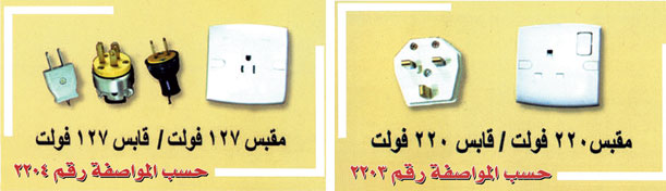تأكيداً لما سبق أن أعلنته الجمارك السعودية بشأن منع دخول كل ما هو مخالف للمواصفات والمقاييس وما فيه ضرر على المستهلك وفقاً للتنسيق مع الهيئة السعودية للمواصفات والمقاييس والجودة فيما يتعلق بتطبيق المواصفات القياسية في القابسات والمقابس «الأفياش» جهد «220، 127» فسيتم اعتباراً من صباح يوم غدٍ الثلاثاء 9-3-1431هـ الموافق 23-2-2010م منع دخول القابسات والمقابس التي لا تتوافق مع المواصفات التي حددتها الهيئة السعودية للمواصفات والمقاييس والتي سبق الإعلان عنها من قبل الهيئة السعودية للمواصفات والمقاييس والجودة والموضحة بالصور المرفقة.