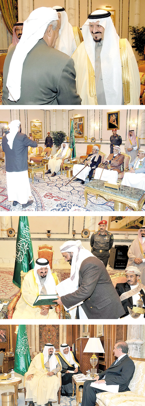 استقبل صاحب السمو الملكي الأمير سلطان بن عبدالعزيز آل سعود ولي العهد نائب رئيس مجلس الوزراء وزير الدفاع والطيران والمفتش العام - حفظه الله - في قصر سموه العزيزية مساء أمس وفداً من مشايخ القبائل والأعيان بالجمهورية اليمنية الشقيقة برئاسة الشيخ ناجي عبدالعزيز الشائف الذين قدموا للسلام على سموه وتهنئته بسلامة العودة إلى المملكة. وقد أكد الوفد اليمني في كلمة لهم أن الوفد يجتمع لأول مرة في تاريخ اليمن من مختلف قبائله لزيارة سمو الأمير سلطان بن عبدالعزيز رعاه الله.