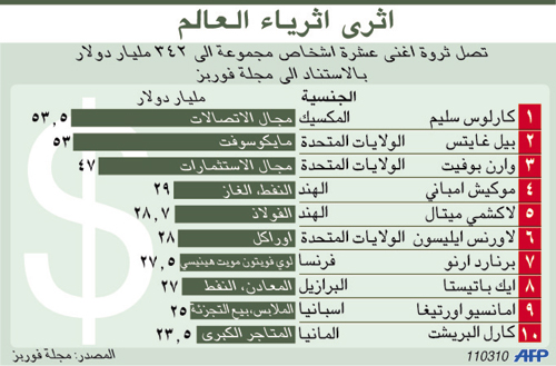 قالت مجلة فوربس إن رجل الأعمال المكسيكي كارلوس سليم أصبح أغنى أغنياء العالم دافعاً بيل جيتس مؤسس شركة مايكروسوفت إلى المركز الثاني وذلك في حين نمت ثروة مليارديرات العالم بنسبة 50 في المئة خلال العام الماضي. وقالت المجلة إن هذه هي ثاني مرة فقط منذ عام 1995 التي يفقد فيها جيتس الصدارة مقدرة صافي ثروة سليم بقيمة 53.5 مليار دولار مقارنة مع 53 مليار دولار يملكها جيتس بينما جاء المستثمر وارن بافيت في المركز الثالث بثروة قدرها 47 مليار دولار.