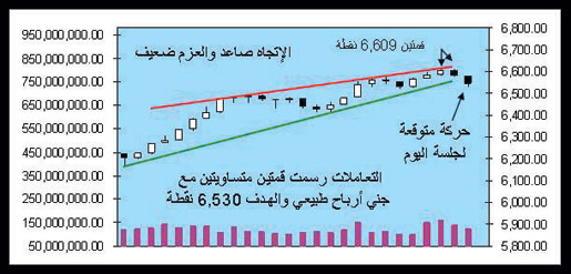 لوحظ في جلسة الأمس أن كبار المضاربين لديهم مشكلة في تسويق كمياتهم في شركات المضاربة، خصوصا مع حرمان السوق من التسهيلات، ولفت الانتباه قصر النظر في تحقيق الأرباح والعمل وفق معطيات السوق، ويبدو أن التحالفات باتت صعبة حالياً والثقة معدومة لكن على الرغم من ذلك نشهد تحول 50% من سيولة السوق هذه الأيام نحو الشركات الصغيرة والمتوسطة لكن بعقلانية أكثر من الماضي وهي نقطة إيجابية تسجل هذه الأيام، وبعد دمج حركة التداول لآخر 25 جلسة يرجح أن يغلق السوق عند 6.541 نقطة بعد زيارة سريعة لمستوى 6.530 نقطة.