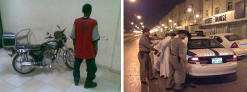 كان ذلك عندما اشتبهت إحدى فرق دوريات الأمن في شخص على دراجة نارية صينية الصنع لونها أسود، ورد عليه مجموعة من البلاغات تتضمن قيام قائدها بخطف حقائب السيدات من الشارع وهو راكب على دراجته، فتم تطويق الشوارع المحيطة ورصدت الدراجة على أحد الشوارع الرئيسة وتم ضبط السائق والذي انطبقت عليه أوصاف الجاني الذي حاول خطف حقيبة سيدة وسلم لمركز شرطة المربع. كما تمكنت فرق دوريات الأمن بوسط الرياض من القبض على أربعة جناة قاموا بسرقة أربع أسطوانات غاز من داخل أحد المطاعم الكبيرة وعربية دفع يدوي، حيث لاحظت إحدى الفرق التي يقع المربع في حدود منطقة عملها أن هناك حركة غير طبيعية في داخل المطعم، فترجل أفراد الدورية وشاهدوا الجناة وهم يقومون بإخراج المسروقات، وعلى الفور تم ضبطهم متلبسين، وسلموا لمركز شرطة البطحاء.