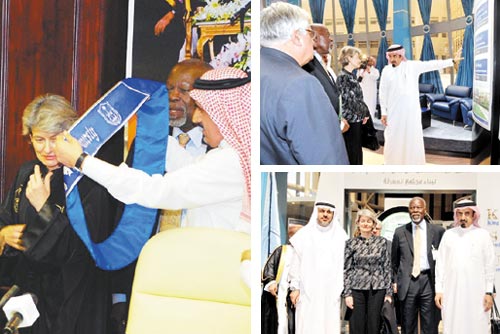 وقد قامت المدير العام لمنظمة اليونسكو والوفد المرافق لها برفقة معالي مدير الجامعة بزيارة المعرض التوثيقي بالجامعة.. وكذلك مكتبة الأمير سلمان المركزية.. واستمعت إلى عرض عن الجامعة من سعادة الدكتورة أمل فطاني المشرفة على أقسام العلوم والدراسات الطبية بالجامعة.. واختتمت زيارتها بتكريمها بميدالية الجامعة.