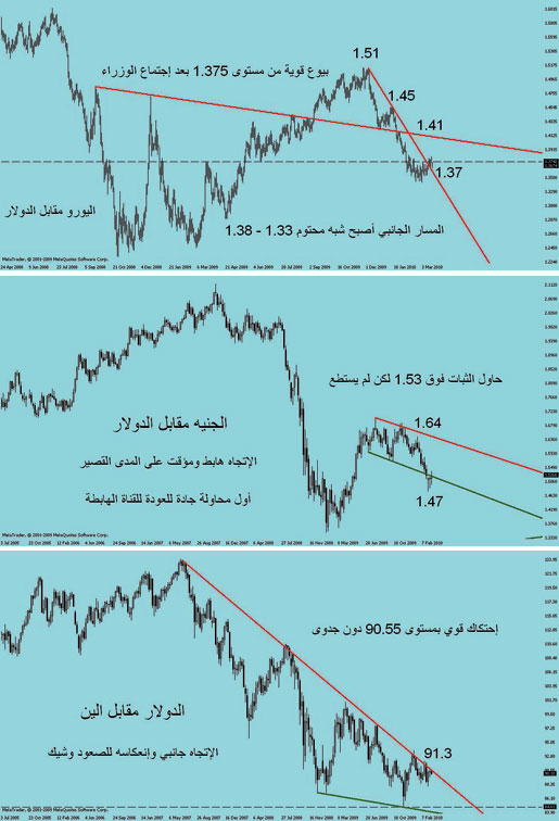 لم يكن هذا الأسبوع حليفا للدولار، بل اتفقت معظم العملات على كبح جماحه، وهو حاليا يفضل ترتيب متوسطاته وإعادة تبويب حساباته في المنطقة من 76 إلى 78 أمام سلة عملاته تمثل منطقة تجمع لمتوسط 100 و200 يوم، وهي بلا شك سند له هذه الأيام. هذا لم يكن سببا كافيا لانتقال المتحوطين إلى الذهب، والسبب يعود إلى أن تصريحات المركزي الصيني وصندوق النقد الدولي بشأن الذهب؛ حيث الأول يتظاهر بعدم رغبته في الشراء، والآخر يعلن نيته في البيع، لكن كلا الأمرين لم يحدثا؛ وبالتالي فضل المتحوطون تأجيل صفقاتهم فيه. أما النفط خصوصا خام نايمكس فتمكّن من زيارة 82.8 دولار للبرميل لسبب واحد هو أن وكالة الطاقة الأمريكية أعلنت ارتفاع مخزوناتها من النفط إلى مليون برميل، أقل من القراءة السابقة؛ ما أعطى الخام لياقة جيدة في التداول. وبصهر هذه المعطيات نصل إلى نتيجة مفادها أن الدولار لم يهجر تماما من المشترين، ولديه المزيد من المفاجآت السعرية، لكن يمكن وصف ما يحدث بالهدنة.