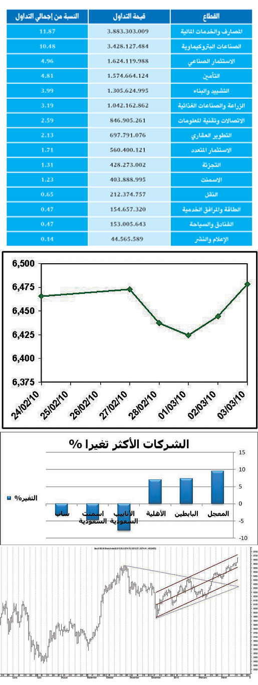 حافظ السوق على أداء ثابت تقريباً طيلة جلسات الأسبوع الماضي في حين أن أربعة جلسات من أصل خمس تمكن المؤشر فيها من تحقيق مكاسب باستثناء جلسة تداول الاثنين التي شهدت تراجع المؤشر إلى مستوى خط الدعم قبل أن يتمكن المؤشر والسوق من العودة إلى الارتفاع من جديد نحو مستويات عليا جديدة ساهم إقبال المستثمرين على السوق في دفع السوق نحو الارتفاع متأثرين بالأداء الإيجابي للأسواق العالمية وأسعار النفط التي وصلت إلى مستوى 82 دولاراً للبرميل كما أن الأداء الإيجابي للقطاع البنكي ساهم أيضاً في دفع السوق نحو مزيد من الإيجابية ليصل المؤشر بإغلاقه إلى مستوى المقاومة 6.670 والذي توقفت عنده تحركات السوق بنهاية الأسبوع وعزز هذه الإيجابية الانطلاقة القوية للمؤشر والتي تمكن فيها من الإغلاق أعلى من مستوى القمة السابقة عند 6.570 نقطة والتي تم تسجيلها نهاية شهر أكتوبر الماضي 2009.
