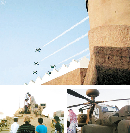لفت معرض القوات المسلحة المقام على أرض الجنادرية أنظار الزوار في أول أيامه لما تضمنه المعرض من استعراضات أرضية وجوية، حيث نشرت القوات المسلحة معداتها الأرضية والبحرية أمام الزوار من طائرات وهليكوبترات ودبابات ومدفعيات حديثة ومتقدمة.. بالإضافة إلى كاسحات الألغام والربورت الآلي، بينما رسمت العروض الجوية من خلال فريق الصقور السعودية علامات التأكيد إلى ما وصلت إليه القوات المسلحة من تطور وتقدم في جميع المجالات.