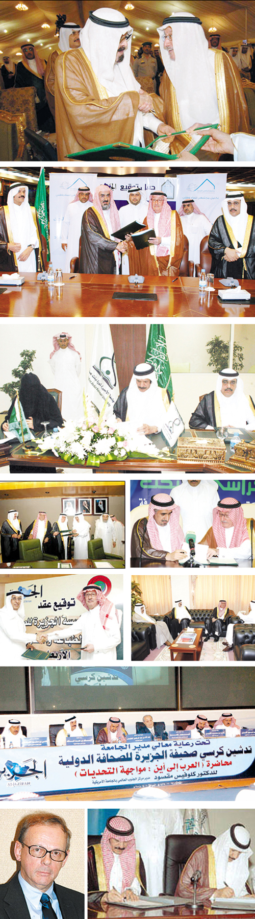 وهناك.. تم التوقيع على عقد تأسيس كرسي (الجزيرة) للدراسات الصحفية بين معالي مدير الجامعة الدكتور أسامة بن صادق طيب ورئيس مجلس إدارة مؤسسة الجزيرة للصحافة الشيخ مطلق بن عبدالله المطلق.