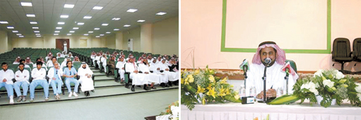 التقى معالي نائب وزير التعليم العالي الدكتور علي بن سليمان العطية طلاب كليات جامعة الحدود الشمالية، خلال زيارته الحالية للمنطقة، وذلك على مسرح كلية العلوم بالجامعة. وخاطب معاليه الطلاب قائلا: نحن حريصون كل الحرص على تقديم الخدمات التي تتطلعون إليها، والوزارة تعمل جاهدة للرقي بالتعليم؛ حرصاً منها على أن تكون جامعات المملكة العربية السعودية في مصاف الجامعات العالمية في ظل الدعم اللامحدود الذي يحظى به قطاع التعليم في بلادنا من لدن قائد المسيرة المباركة وباني نهضة البلاد خادم الحرمين الشريفين الملك عبدالله بن عبدالعزيز وسمو ولي عهده الأمين - حفظهما الله -. وأكد العطية أن وزارة التعليم العالي في السنوات الخمس الماضية قامت بنهضة تطويرية شاملة؛ حيث انتشرت الجامعات بالمملكة حتى وصلت إلى 24 جامعة حكومية وتسع جامعات أهلية، وانتشر التعليم العالي في 82 محافظة، وبلغ عدد المبتعثين إلى 82 ألف مبتعث في الخارج. مشيراً إلى أن وزارة التعليم العالي ركزت على البحث العلمي بالجامعات. كما تطرق إلى المشاريع الجامعية، وهي المدينة الجامعية لجامعة الحدود الشمالية، التي تقع على مساحة سبعة ملايين متر مربع، وتشمل المستشفى الجامعي وإسكانا لأعضاء هيئة التدريس والطلاب ومحطة للكهرباء، كما شملت المشاريع مشروع لكلية العلوم يستوعب أربع كليات، كما تم توقيع عقد لبناء كلية العلوم التطبيقية، ومشاريع كليات الصيدلة والطب والتمريض والآداب والتربية. بعد ذلك أجاب الدكتور العطية عن أسئلة الصحفيين.