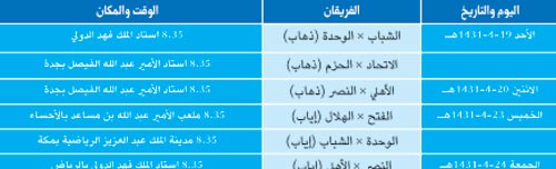 أعلنت الرئاسة العامة لرعاية الشباب (إدارة الإعلام والنشر) عن قيام القناة الرياضية السعودية بالنقل المباشر لعدد من مباريات دور الثمانية في مرحلتي الذهاب والإياب من مسابقة كأس خادم الحرمين الشريفين للأبطال للموسم الرياضي 1430-1431هـ التي ستنطلق منافساتها اعتباراً من يوم الأحد 19-4-1431هـ، وذلك على النحو التالي: