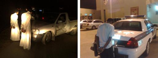 وفور وصول المعلومات وجه مدير دوريات محافظة الخرج بتشكيل قوة من فرق دوريات الأمن العاملة في الميدان والانتقال لموقع الجناة وفور ملاحظتهم للقوة لاذوا بالفرار على عدد 4 سيارات وتم متابعتهم من قبل الفرق داخل مناطق صحراوية وعرة حتى تم القبض على سيارتين الأولى نوع داتسون غمارة والسيارة الثانية نوع داتسون. جرى تسليم الأشخاص والسيارتين وعدد 5 جوالات لشرطة محافظة الخرج.