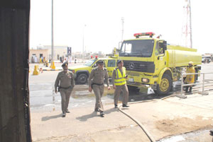 شب صباح أمس حريق في مستودع تابع بالمحطة المركزية لشركة الكهرباء بجازان وخرج الحريق عن السيطرة ما أدى إلى تطوره وانتشار ألسنة اللهب والدخان في الموقع، وتدخل رجال الدفاع المدني للقيام بعمليات الإخلاء وإخماد الحريق وإنقاذ المصابين والمحتجزين من العاملين في المنشأة. ووفقاً للناطق الإعلامي في الدفاع المدني بمنطقة جازان النقيب يحيى القحطاني إن ما حدث تجربة فرضية طبقتها الإدارة على منشأة شركة الكهرباء بالمنطقة. وأشار مدير إدارة الدفاع المدني والمشرف على الفرضية النقيب ناصر القحطاني إلى أهمية تنفيذ مثل هذه الفرضية، للتعرف على المنشأة والمداخل الرئيسة ومخارج الطوارئ وتشغيل وسائل السلامة فيها.