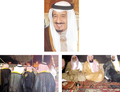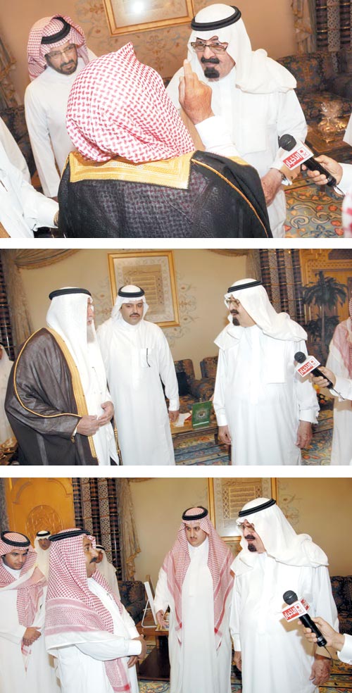 استقبل خادم الحرمين الشريفين الملك عبدالله بن عبدالعزيز آل سعود - حفظه الله - في مزرعته بالجنادرية أمس علي بن خلف الأحمدي الحربي وأخاه لافي بن خلف الأحمدي الحربي وخلف وعبدالله وفهد وسعود ومحمد أبناء علي الأحمدي الحربي وحجاب بن عبدالله بن نحيت، الذين أعلنوا أمام خادم الحرمين