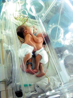 وضعت سيدة فلسطينية في مستشفى ناصر بمدينة خان يونس، جنوب قطاع غزة مولودها التوأم السيامي الملتصقين من جدار البطن، وأوضحت المصادر الطبية في مستشفى ناصر أن التوأم هما بنتان وجرى ولادتهما يوم الـ27 من مارس الماضي، مبينة أنهما في وضع مستقر داخل حضانة المستشفى، وتعد هذه