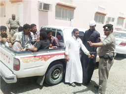 دوريات أمن الطرق بقيادة العريف بتال الكدّه والجندي أول عيد نوار اشتبهت في السيارة الوانيت التي حاول قائدها سلك الطريق الصحراوي بعد مشاهدته للدورية؛ ما استدعى متابعته وإيقافه رغم محاولته الفرار. وعند التحقق من السائق ومرافقه والركاب اتضح أن السائق ومرافقه من سكان خميس مشيط، وكانا يحاولان تهريب المخالفين لمحافظة جدة.تم تحويل المخالفين والمهربين لشرطة رضوان التي بدأت في التحقيقات بقيادة النقيب مشعل الثبيتي والجندي أول فايز الذيابي والجندي سالم الذيابي.
