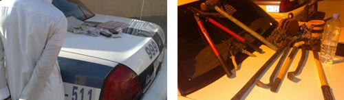 كان ذلك عندما استوقفت إحدى فرق دوريات الأمن سيارة من نوع كورلا موديل 2005 اللون فضي بقيادة شخص وبتفتيش السيارة وجد بداخلها مقصات حديد وتلفزيون ورسيفرات وعدد «2» قفازات وقفل مكسور وعدد «5» جوالات، تم تسليم الجاني والمضبوطات لمركز شرطة العليا للتحقيق معه حول تلك المضبوطات.