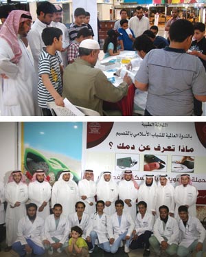 أقامت اللجنة الطبية في الندوة العالمية للشباب الإسلامي في القصيم حملة توعوية واسعة تحت عنوان (ماذا تعرف عن دمك 2) وذلك في مركز العثيم مول ببريدة وبرعاية رسمية من مستوصف رشيد الطبي ببريدة ورعاية طبية من مركز الأمير سلطان لطب وجراحة القلب في القصيم ونفذت على مدى يومين متتالين الأربعاء والخميس الماضيين، حيث احتوت الحملة على قسمين منفصلين للرجال وللنساء وكل قسم احتوى على خمس محطات متوالية تقوم بفحص الزائر، فالمحطة الأولى لقياس نسبة السكر في الدم والثانية لقياس ضغط الدم والثالثة لحساب الوزن والطول والرابعة لحساب معدل كتلة الجسم والخامسة محطة استشارية يوجد فيها استشاريون يعلقون على قراءات الزائر ويقدمون له الاستشارات الطبية والنصائح المناسبة.