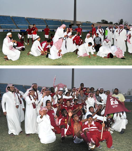 زحفت جماهير النادي الفيصلي بحرمة يوم الجمعة الماضي إلى الأحساء لمساندة فريقها الكروي في مباراته الحاسمة أمام هجر، حيث حضرت إلى ملعب المباراة ووقفت مع الفريق وهتفت باسمه رافعة شعاره (العنابي والأبيض)، وبعد المباراة التي أكد فيها أصحاب السعادة صعودهم إلى دوري الأضواء والشهرة (دوري زين للمحترفين) زفت الجماهير فريقها (البطل) واحتفلت بالصعود مع إدارة النادي واللاعبين داخل الملعب وأطلقت أهازيج الفرح.. ورافقت الفريق من الأحساء رافعين أعلام النادي ومرددين أهازيج جميلة.. وأكملوا فرحتهم بهذا الإنجاز في مقر النادي بحرمة.. وكانت مشاعر معبرة ورائعة تواكب روعة العنابي وإنجاره.. كما توافد على النادي محبو الفيصلي في صورة رائعة.. تعكس حبهم لناديهم.
