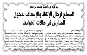 (الجزيرة) التقت بعدد من المسؤولين والمسؤولات الذين ثمنوا هذه المبادرة الإنسانية ، والتي تدل على حرص سموه على سلامة بناته الطالبات من أي أذى أو مكروه في حالات وقوع الحوادث.