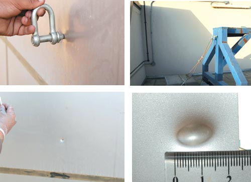 4 - أثر ارتطام غائر غير نافذ ظهر عليه الأثر وما يحيط به آثار مسح للأتربة يقع أسفل الحافة السفلية لنافذة دورة المياه التي تقع بالدور الثاني (على يمين المدخل الشمالي للمبني) ويبعد عن النافذة مسافة (86.5 سم)، وارتفاعه عن الأرض مسافة (12.40)م، بيضاوي الشكل منتظم الحواف تبلغ أبعاده (1.4× 0.9) سم.