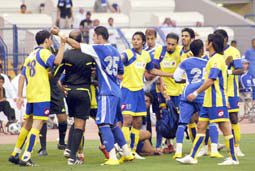 حينما أبدى كثير من الرياضيين إن لم يكن جميعهم تخوفهم من العودة (الاضطرارية) للصافرة المحلية في المباريات (الكبرى) فإنهم لم يذهبوا بعيداً، وكانوا على حق في تخوفهم.. فقد فشل الدولي خليل جلال الذي سيشارك بعد 51 يوماً من الآن في مونديال كأس العالم في جنوب إفريقيا فشلاً ذريعاً في قيادة ديربي كأس الأبطال، وأصر بصافراته وبطاقاته و(مجاملاته) وفوقيته على إفساد متعة المواجهة الكبرى، وتسبب في شحن اللاعبين وكاد يذهب بالمباراة إلى منحى آخر رغم أنها كانت تسير إلى حيث النتيجة المنطقية التي تعكس واقع الفريقين الفني داخل أرض الملعب.الهلال تقدم بثلاثية نظيفة في وقت قياسي بعد أن لعب في (نصف ملعب) فبدأ جلال في تسيير الصافرة وفق رؤيته هو لا وفق القوانين واللوائح فغض طرفه عن طرد لاعب النصر فيجاروا الذي تعمد ضرب لاعب الهلال رادوي بكوعه (الدقيقة 39 و48 ثانية)، ثم غض طرفه عن إنذار مهاجم النصر ريان بلال الذي ارتكب خطأ ضد حارس المرمى الهلالي حسن العتيبي (الدقيقة 45 و15 ثانية) عدا العديد من الأخطاء التي غض طرفه عنها ربما رأفة بحال الفريق الأصفر.. وفي الشوط الثاني طرد لاعب الهلال أحمد الفريدي بعد أن تعجل في إشهار البطاقة الصفراء الأولى له وأتبعه بمدير الفريق سامي الجابر، واحتسب ضربة جزاء لمصلحة النصر اتفق أغلب المحللين على عدم صحتها.
