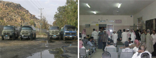 صورة متكررة لصهاريج المياه وهي تجوب الشوارع ليلاً ونهاراً لإيصال المياه لطالبيها إثر الطوابير التي كانت ولا زالت عنواناً لمقر الأشياب الخاصة بالتحلية، فبدلاً من أن تكون المياه واصلة للمنازل كالمعتاد والمُتعارف عليه أصبحت تُنقل للمنازل عن طريق صهاريج المياه وبمبالغ مالية متنوعة قد لا يستطيع دفعها الأرامل أو أصحاب الحاجة والظروف، وبعض النساء من تذهب بنفسها وتطلب الصهريج وتُشارك الرجال في الانتظام بالطابور والانتظار لحين موعد خروجه من مقر الشيب.