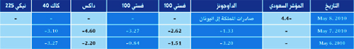 يوضح الجدول (2) كيفية تفاعل أهم البورصات العالمية مع أزمة اليونان.. فبداية يعرض الجدول البورصات الأوربية الكبرى، والتي تُعتبر أكثر ارتباطاً بالأزمة (على اعتبار أنها داخل منطقة اليورو).. وسنركز هنا على استعراض أداء هذه البورصات في إغلاق يوم 7 مايو، باعتبار أنه اليوم الذي انتشر فيه الذعر بالأسواق العالمية.. فقد تراجع مؤشر الفستي 100 البريطاني في هذا اليوم بنسبة 2.6%، في حين تراجع مؤشر الداكس الألماني بنسبة 3.3%.. أما الكاك 40 الفرنسي، فقد تراجع بنسبة 4.6%.. أما بالنسبة للبورصة الأمريكية ممثلة في الداو جونز، فقد تراجع بنسبة 1.3% في يوم 7 مايو وبنسبة 3.2% في 6 مايو.. أي أن تراجعات الأسواق الأوربية والأمريكية الكبرى انحصرت ما بين 1.3% إلى 4.6%.. في المقابل، فإن مؤشر نيكي 225 الياباني، فقد تراجع بنسبة 3.1%.. وهذه التراجعات الحادثة جميعها فُسرت على أساس أنها استجابة لمخاوف أزمة مديونية اليونان، وفُسرت على أساس أن اقتصاديات هذه البورصات ترتبط بقوة بالاقتصاد اليوناني.. ويتوقع أن يكون لأزمة ديون اليونان تأثيرات سلبية حقيقية عليها.. أما الأمر الغريب أن السوق السعودي تفاعل مع هذه الأزمة مثلما تفاعلت معها الأسواق الأوربية المعنية باليونان، حيث خسر المؤشر السعودي (تاسي) نسبة 4.4%، وهي أعلى نسبة تراجع بعد مؤشر (الكاك 40).. أي أن حتى تبرير أن استجابة المؤشر كانت استجابة نفسية جاءت مبالغاً فيها.