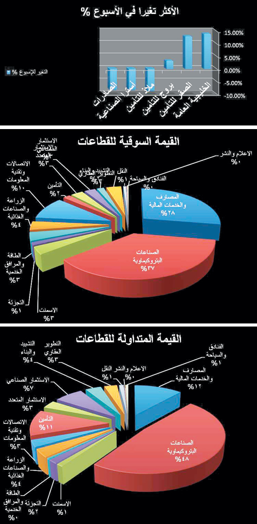 وبلغت قيمة التداول الأسبوع الماضي 22.4 مليار ريال وبلغت كمية الأسهم المتداولة 927.1 مليون سهم، نفذت هذه الكميات والقيم من خلال تنفيذ 456 ألف صفقة.. وعن حصص قطاعات السوق من إجمالي القيم والكميات المتداولة.. فقد استحوذ قطاع الصناعات البتروكيماوية على 48.2% أي 10.8 مليار ريال من إجمالي القيم المتداولة واستحوذ على 40.77% 379.1 مليون سهم ليكون القطاع الأكثر نشاطاً بالقيمة والكمية خلال الأسبوع الماضي.. تلاه قطاع المصارف والخدمات المالية الذي استحوذ على 11.61% أي 2.6 مليار ريال من إجمالي القيمة المتداولة و17.5% أي 162.5 مليون سهم من إجمالي الكمية المتداولة.. وثالث النشطين كان قطاع التأمين الذي بلغت قيم التداول فيه 2.5 مليار ريال ما يمثل 11.13% من إجمالي القيم المتداولة وكمية تداول بلغت 77.1 مليون سهم ما يمثل 8.3%.. أي أن هذه القطاعات الثلاثة قد مثَّلت 71% من إجمالي القيم المتداولة في السوق و66.55% من إجمالي الكميات المتداولة بشكل آخر فإن السيولة قد تركزت داخل هذه القطاعات وعبر أسهمها.. في حين أن 29% من إجمالي القيم المتداولة قد تفرقت على القطاعات الأخرى المتبقية وهي 12 قطاعاً ومثل قطاع الإعلام والنشر القطاع الأقل نشاطاً بالقيمة والكمية بعد استحواذه على 0.13% من إجمالي الكميات المتداولة و0.16% من إجمالي القيم المتداولة.. وقد انعكس توزيع القيم والكميات المتداولة على القوائم التفصيلية للأسهم المدرجة الأكثر ارتفاعاً وانخفاضاً ونشاطاً بالقيمة والكمية.. وبنهاية الأسبوع الماضي فإن متوسط القيم اليومية المتداولة قد انخفض بشكل طفيف من 4.5 مليار إلى 4.4 مليار ريال، وبلغ متوسط قيمة الصفقة الواحدة 48.4 ألف ريال بمتوسط حجم للصفقة الواحدة بلغ 2000 سهم. وتمكنت ثلاث شركات من قطاع التأمين في أن تستحوذ على الثلاثة مراكز الأُول في قائمة الأسهم الأكثر ارتفاعاً.. حيث جاء سهم الخليجية للتأمين على رأس هذه القائمة بارتفاعه بنسبة 13.97% بعد أن اختتم الأسبوع عند مستوى 31 ريالاً، وتلاه سهم الصقر للتأمين الذي ارتفع إلى مستوى 61 ريالاً محققاً مكاسب بنسبة 12.96%.. وثالثاً جاء سهم بروج للتأمين بعد تحقيقه مكاسب بنسبة 3.26% عند مستوى 34.8 ريال.