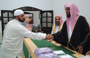 كرم الشيخ عبدالله المبارك مدير عام فرع وزارة الشؤون الإسلامية والأوقاف والدعوة والإرشاد بمنطقة تبوك الفائزون في المسابقة الخاصة بنصرة النبي محمد - صلى الله عليه وسلم - (الثالثة والعشرين) التي أعدتها شعبة دعوة وتوعية الجاليات بتبوك، وكذلك تكريم خريجي الدورة العلمية الثالثة عشرة للجاليات النطاقين باللغة الأردية والهندية وذلك في مركز الأمير فهد بن سلطان الاجتماعي بحضور الشيخ سالم باطرفي مدير مركز الدعوة والإرشاد وتوعية جاليات تبوك، حيث أقيم حفل خطابي بدئ بالقرآن الكريم فكلمة لأحد المشاركين في المسابقة، ثم كلمة الشيخ باطرفي، إثر ذلك شكر الشيخ المبارك الحضور من أبناء الجاليات، منوهاً في كلمته بحرص ودعم ولاة الأمر لتلك الأعمال الجليلة، كما تطرق في كلمته لما يلقاه فرع الوزارة من دعم ومؤازرة من أمير منطقة تبوك ووزير الشؤون الإسلامية كما تحدث عن أهمية حقوق النبي عليه السلام والذود عن سنته وشخصه الكريم، وفي نهاية الاحتفال تم تكريم الفائزين والمشاركين والداعمين لأعمال شعبة جاليات تبوك.