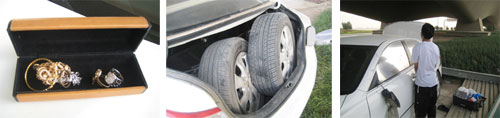 وبالعودة للسيارة والتأكد من رقم الهيكل اتضح أن السيارة مسروقة وصادر عليها تعميم من مركز شرطة الحمراء ، وبتفتيش السيارة عُثر بداخلها عدد 2 كفرات غير عائدة للسيارة وماطور هواء وجهاز بلايستيشن و قطع ذهب وسلاح أبيض «سكين». وملابس جديدة عبارة عن شمغ وملابس أخرى داخل حقيبة من الحجم الكبير، كما وجد داخل السيارة عدة رحلات جديدة عبارة عن خيمة بلاستيك وملحقاتها تم رفع الحادث مرورياً ورفع البصمات من قبل الأدلة الجنائية سلم الجناة بالمضبوطات وكافة المعلومات لمركز شرطة الملز للتحقيق معهم حيال ما نسب إليهم ومعرفة مدى علاقتهم بالقضايا المماثلة.