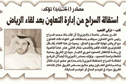 رغم الاتصالات الكثيرة التي تلقتها «الجزيرة» ورسائل جوال النادي التي حاولت نفي خبر استقالة رئيس نادي التعاون الأستاذ محمد السراح ومحاولة التقليل من صحة الخبر عندما نُشر «بالجزيرة» قبل شهر في عدد 13717 ليوم الاثنين الخامس من شهر جمادى الأولى، إلا أننا نؤكد الآن صحة ومصداقية مصادرنا الخاصة حول الاستقالة التي تقدم بها رئيس نادي التعاون المهندس محمد السراح.