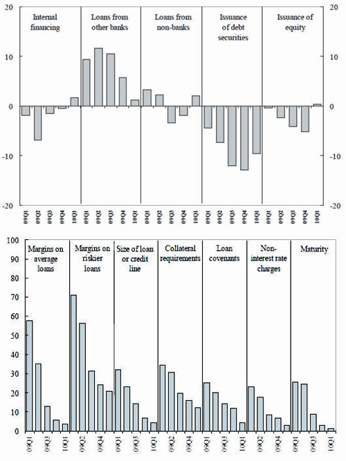 استطلاع قام به المركزي الأوروبي، أُعلن عن نتائجه مطلع هذا الشهر، تم المسح لما يقارب 119 بنكا حول سوق الإقراض، من نتائجه تراجع نمو الإقراض 13 % للربع الأول من هذا العام مقارنة بتراجع 8 % للربع الأخير من 2009م، أيضا ائتمان المستهلك للربع الأول يتراجع 13 % مقارنة بتراجع 10 % للربع الرابع من 2009م، كما أن معدلات الإقراض بين البنوك (LIBOR) انخفضت عن النصف الثاني من العام الماضي، ويظهر الجدول (رقم 1) أن متوسط هامش الإقراض في أدنى مستوى له منذ بداية العام الماضي، كما أن مستوى المخاطرة فيها تراجع من قبل المصرفيين، أيضا حجم القروض الائتمانية تراجع 11 % عن الربع الأخير من 2009م.