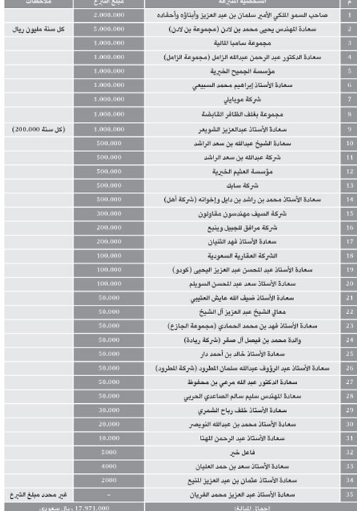 وفيما يأتي قائمة بأسماء المتبرعين، وقيمة تبرعاتهم: