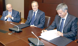 أعلن ريال مدريد أمس الاثنين أن البرتغالي جوزيه مورينيو بات المدرب الجديد للفريق الذي ينافس في دوري الدرجة الأولى الإسباني لكرة القدم. ووقع المدرب البرتغالي على عقد لمدة أربع سنوات مع النادي الإسباني العملاق عقب انتقاله من انترناسيونالي الإيطالي بطل أوروبا. وقال مورينيو في مؤتمر صحفي عقده النادي في استاد سانتياجو برنابيو: «أعشق خوض التحديات وهذا يمثل تحدياً كبيراً بالنسبة لي. أمتلك الكثير من الثقة في نفسي وقدراتي كمدرب». وأضاف مورينيو: «أريد أن أشكر مجلس الإدارة لتعييني وأتعهد بألا أتغير.. أنا جوزيه مورينيو وقد التحقت بالعمل هنا بكل مميزاتي وعيوبي». وتابع «قوة الفرق التي قمت بتدريبها تنبع من الروح الجماعية وليس من اللاعبين كأفراد أو من المدرب. إذا ما أدرك الجميع ذلك فلن يكون من الصعب تحقيق نتائج جيدة». ورحب خورخي فالدانو المدير الرياضي لريال مدريد بمورينيو في النادي الفائز ببطولة أوروبا تسع مرات والذي فشل في الفوز بأي لقب الموسم الماضي. وقال فالدانو: «إنه لشرف كبير وجود واحد من أكثر المدربين مكانة في العالم لدينا».