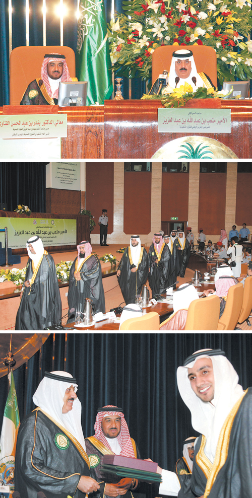 بعد ذلك تفضل سموه بتسليم شهادات التخرج التي تسلمها نيابة عنهم أوائل خريجي الدراسات العليا، والحاصلين على مراتب الشرف في بكالوريوس الطب والجراحة، وهم:
