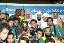 توج معالي مدير جامعة الإمام محمد بن سعود الاسلامية الأستاذ الدكتور سليمان بن عبدالله أبا الخيل فريق كلية الدعوة والإعلام للمرة الأولى في تاريخها بكأس معاليه لكرة القدم والميداليات الذهبية بعد فوزه مساء الإثنين الماضي على منافسه فريق كلية الاقتصاد في المباراة الختامية بنتيجة 3-6، وذلك على الإستاد الرياضي بالمدينة الجامعية، وبحضور وكلاء الجامعة وعمداء الكليات وعدد من الجماهير الرياضية، كما سلم معاليه فريق كلية الطب بكأس الفريق المثالي في الدورة، تسلمه نيابةً عنهم د. أسامة الخميس، وهداف البطولة لمهاجم كلية الدعوة والإعلام تركي الجرجير بعد تسجيله 16 هدفاً، في حين حصل على أفضل لاعب في البطولة محمد المهنا مهاجم فريق الاقتصاد، بينما حصل على أحسن حارس في الدورة حارس فريق الدعوة والإعلام فواز الدريعي.
