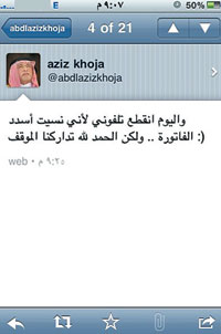 تفاجأ متصفحو البرنامج الاجتماعي الشهير تويتر بكتابة ملاحظة من وزير الثقافة والإعلام الدكتور عبدالعزيز خوجة على حائطه في الصفحة الخاصة به قائلا: (اليوم انقطع تلفوني لأني نسيت أسدد الفاتورة... ولكن الحمد لله تداركت الموقف). |