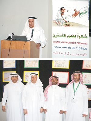 نظم المركز الوطني لأبحاث الشباب بجامعة الملك سعود وبحضور وكيل الجامعة بالنيابة الدكتور عبد العزيز الرويس ورشة عمل بعنوان: (بيئات جامعية خالية من التدخين من أجل شباب أصحاء) حضرها عدد من وكلاء الجامعة وعمداء الكليات وممثلون من وزارة التعليم العالي والجامعات السعودية وممثلون عن منظمة الصحة العالمية وعدد من القطاعات المعنية بالصحة والسلامة بالمملكة ومراكز الأبحاث.. ولقد تضمن الحفل عدداً من الفقرات المرئية والكلمات وعرضا لتجارب الجامعة في هذا الخصوص قدمه نزار الصالح الأمين العام المساعد للمركز.. وكلمة لأمين المركز د. صالح النصار أوضح فيها رؤية الجامعة بأن تكون بحلول عام1432هـ خالية من التدخين -بإذن الله-.. بعد ذلك ألقى وكيل الجامعة الدكتور الرويس كلمة أوضح فيها أهمية المشروع ورغبة الجامعة في أن تكون الرائدة في تبني بيئة خالية من التدخين وأن يتم تعميم هذا المشروع على الجامعات السعودية والدوائر الحكومية التي ترغب في الاستفادة من مخرجات هذا المشروع التي تتماشى مع توجيهات خادم الحرمين الشريفين في هذا الجانب.. هذا وقد أُقيم على هامش هذه الورشة معرض مصور لرسوم كاريكاتيرية بهدف توجيه النقد الهادف ولدعم هذا المشروع.. أعدها وأشرف عليها الزميل رسام الكاريكاتير بالجزيرة عبد الله المرزوق بمشاركة من بعض زملائه رسامي الكاريكارتير.