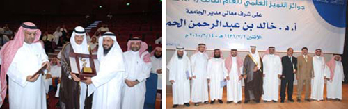 وقد ألقى وكيل الجامعة للدراسات العليا والبحث العلمي الأستاذ الدكتور عبدالرحمن الواصل كلمةً بهذه المناسبة، أكد فيها أن الجامعة تسعد وهي تحتفي بمجموعة من أعضاء هيئة التدريس بجوائز التميز العلمي، وما تقوم به الجامعة من تشجيع وتقديم الحوافز المعنوية والمالية يعكس مدى رغبة الجامعة في تحقيق الريادة العلمية. مشيراً إلى أن الدولة أولت التعليم العالي والبحث العلمي اهتمامًا خاصًا؛ وذلك لإعداد كوادر علمية مؤهلة لدفع عجلة العلم. أعقبه كلمة عميد البحث العلمي الأمين العام لجوائز التميز الدكتور يوسف السليم، ذكر فيها أن الجائزة مرَّت بمراحل عدة منذ أن كانت فكرة حتى أصبحت واقعاً ملموساً، وقد تم إعلان الترشيح لمنح الجوائز في تسعة مجالات. وقال: بعد الفحص الأولي استبعدت اللجنة البحوث التي لم تطابق الشروط والمعايير للترشيح. وذكر أن الجوائز عبارة عن شهادة تقديرية ودرع ومكافآت مالية مقدارها عشرون ألف ريال.