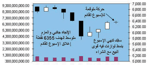 افتتاح نشيط للسوق السعودي استغل الهدوء في الأسواق العالمية مع عطلة نهاية الأسبوع واقتحمت سابك حاجز التسعين ريالاً والقطاع المصرفي إلى 16500 نقطة ثم افتتحت أسواق النفط حيث وصل خام نايمكس إلى 77 دولاراً للبرميل مما عزز الارتفاع بسابك إلى 94 ريالاً، ومن هنا بدأ الاتجاه الصاعد الصغير بالضعف حيث لوحظ أنه في آخر أربع جلسات المؤشر العام يصعد لكن بكميات أقل من الجلسة الخامسة الأخيرة. هذا يدل بكل تجرد أن الزخم والعزم بدأ يضعف لكن لا نستعجل بالحديث عن مرحلة هبوط أخرى، ومن الحصافة أن نتحدث عن اتجاه جانبي ضعيف للأسبوع القادم لكن من يريد فتح مراكز جديدة نظيفة (غير عالقة) فالوقت لم يأت بعد حيث الاتجاه العام ما زال هابطاً ونحن الآن في مرحلة انتعاشة قد يكون الهدف منها المزيد من التصريف حيث الحالة الاقتصادية العالمية لا زالت ضبابية حتى الآن، ومن الظواهر غير المرغوبة للمستثمرين هو نشاط المضاربين القوي في أسهم المضاربة ولم يشهد السوق حتى الآن دخول سيولة استثمارية كبيرة حيث المواصفات والمقاييس المطلوبة لم ترصد حتى الآن (من وجهة نظر خاصة)، وعليه يكون إغلاق السوق الأسبوعي عند 6346 نقطة أدخل المؤشر العام في اتجاه جانبي والعزم ما زال متوسطاً على مستوى الحركة الأسبوعية بناء على فلترة أحجام التداول للأسبوع كله.