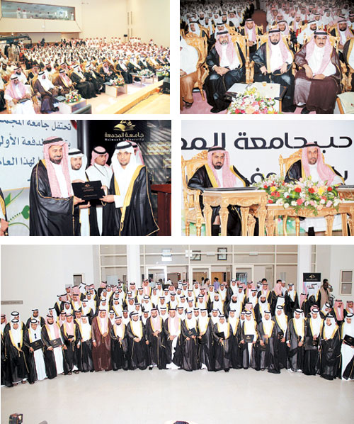 نيابة عن معالي وزير التعليم العالي الدكتور خالد بن محمد العنقري رعى معالي نائب وزير التعليم العالي الدكتور علي بن سليمان العطية بعد مغرب أول أمس الأربعاء حفل تخريج أول دفعة من طلاب جامعة المجمعة للعام الجامعي 1430-1431هـ ممن سيحملون وثائق تخرج جامعة المجمعة، وهو أول احتفال تقيمه الجامعة للخريجين، وقد حضر الحفل الذي أقيم على مسرح مدينة الأمير سلمان بن عبدالعزيز الرياضية بالمجمعة وكيل وزارة التعليم العالي لشؤون الابتعاث الخارجي الدكتور عبدالله بن عبدالعزيز الموسى وأمين عام مجلس التعليم العالي الدكتور محمد بن عبدالعزيز الصالح ومعالي مدير جامعة القصيم الدكتور خالد بن عبدالرحمن الحمودي وسعادة محافظ الغاط عبدالله الناصر السديري وعدد من المسؤولين في وزارة التعليم العالي ورؤساء المراكز ومدراء الدوائر الحكومية في المجمعة، وقد بدأ الحفل الذي قدم فقراته إبراهيم الرويشد ويوسف اليوسف بدخول الخريجين مع كلمة عميد القبول والتسجيل بالجامعة الدكتور أحمد الرميح الذي تحدث عن أعداد الخريجين وكلياتهم وتخصصاتهم ومسيرة عمادة القبول والتسجيل والخطوات التطويرية التي تسير عليها الجامعة، وقال إن الجامعة تزف هذا العام قرابة سبعمائة خريج وخريجة إلى سوق العمل وهم مؤهلين بالعلم النافع الذي ينمي وطنهم ومجتمعهم، وأضاف أنه منذ صدور الأمر السامي الكريم بإنشاء جامعة المجمعة وتكليف مديرها فقد سعت كليات وعمادات وإدارات الجامعة إلى العمل الجاد والدؤوب عن الجامعة الأم بما يكفل الانتقال السلس للصلاحيات والمعلومات من جامعة الملك سعود وجامعة القصيم وجامعة الأميرة نورة إلى جامعة المجمعة لتكون بذلك كليات وعمادات وإدارات مستقلة، وزف الرميح بشرى للجميع بأن الجامعة سوف تقبل في العام الجامعي القادم ما يربو عن أربعة ألاف طالب وطالبة في أكثر من خمسين تخصص مختلف تنتمي لاثنتي عشرة كلية وهذا يشكل زيادة في القبول مقدارها مائة في المائة عما هو عليه في الأعوام الماضية.. وبعد اكتمال الخريجين وأخذ مقاعدهم في الصالة الرئيسية. بدأت فقرات الحفل الخطابي بتلاوة من الذكر الحكيم للطالب خالد أحمد العليان ثم كلمة الخريجين للطالب خالد عبدالرحمن الثميري، بعد ذلك تم عرض فلم تعريفي عن الجامعة تحدث عن مسيرة التعليم في المملكة وجهود وزارة التعليم العالي في ذلك وخطوات جامعة المجمعة خلال الفترة القليلة الماضية، ثم ألقى معالي مدير الجامعة الدكتور خالد بن سعد المقرن كلمة قدم فيها شكره وتقديره لمعالي وزير التعليم العالي الدكتور خالد بن محمد العنقري لرعايته هذا الاحتفال، ورحب بمعالي نائبه الدكتور علي بن سليمان العطية لتشريفه هذا الحفل رغم كثرة مشاغله وارتباطاته معتبراً هذه الرعاية وهذا الحضور دعماً كبيراً لجامعة المجمعة ومنسوبيها ودافعاً كبيراً لمزيد من العطاء، وذكر أن احتفال اليوم بتخريج أول دفعة من الطلاب الذين سيحملون أول وثيقة تخرج من جامعة المجمعة هو مدعاة للفخر والإعزاز، فبقدر ما يمثل هذا الحفل للطلاب من ختام مرحلة عمرية وفترة دراسية وحصاد جهد سنوات والتوجه لميدان العمل ليساهموا في تنمية بلادهم وخدمة مجتمعهم.