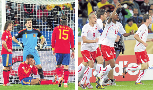 لكن الصحيفة أضافت أن»الكوب لا يزال نصفه ممتلئا» واعتبرت على غرار الصحيفة الرياضية اليومية «أس» أنه لا يزال ممكنا تصحيح الموقف في المباراتين المتبقيتين في المجموعة الثامنة أمام تشيلي وهندوراس. وعنونت صحيفة «أ ب ث»: «الخيبة»، واعتبرت «أل موندو ديبورتيفو» أنها»هزيمة لا تصدق» لأحد المنتخبات المرشحة في جنوب إفريقيا. قد أصبحت إسبانيا في»منطقة الخطر القصوى» بحسب» أل بيريوديكو». وأضافت»ماركا» أن الإسبان»لم يكونوا محظوظين» أمام المرمى السويسري، لكنهم» بالغوا في التمرير ونسوا الاتجاه صوب المرمى»، في حين كتبت» أل بايس» أن إسبانيا» بقيت بكماء أمام الجدار السويسري». في حين كالت الصحف السويسرية المديح لمنتخب بلادها الذي حقق فوزا تاريخيا على إسبانيا 1 - صفر. والفوز هو الأول لسويسرا على إسبانيا في 19 مباراة منذ تأسيس الاتحاد السويسري قبل 105 سنوات. وجاء في عنوان صحيفة «لوتان» «شجاعة، ذكاء، لقد ظفر المنتخب السويسري بحق الحلم»، واعتبرت بأنها شاهدت» ربما أفضل عرض على الإطلاق في تاريخ الكرة السويسرية». وكان لسان حال صحيفة 24» ساعة» ماثلا وقالت:» تستطيع سويسرا أن تحلم»، أما «لوماتان»، فأشارت إلى»المباراة الأسطورية»، خصوصا بأن الفوز لم يكن في متناول المنتخب السويسري. واحتفل السويسريون بهذا الإنجاز الذي حققه المنتخب على نظيره الإسباني بطل أوروبا عام 2008 بنزولهم إلى الشوارع، وإطلاق العنان لأبواق سياراتهم ولحناجرهم. وأرجعت 24» ساعة» الفوز إلى»مدرب خارج عن المألوف، وحارس متميز، وخط دفاعي حديدي». وأضافت» تستطيع سويسرا أن تنظر بتفاؤل إلى مستقبلها، وحيت فريقا منظما جدا، وشجاعا، ويتميز بالدقة عندما كان هذا الأمر ضروريا». لكنها كانت واقعية عندما اعتبرت بأن الفوز يشبه» المعجزة»، لأن المنتخب الإسباني سيطر بشكل شبه كلي على مجريات اللعب». أما «لوتان» فأضافت» لا شك بأن هذا النجاح تحقق بسبب التحضير المثالي والبدني والنفسي والتكتيكي للمنتخب».