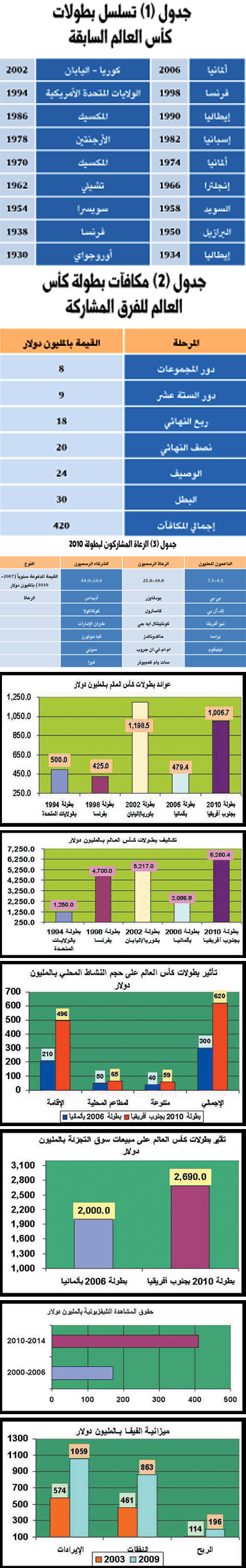 كثير منا لا يعرف عن كأس العالم سوى رونالدو البرازيلي بأهدافه الـ 15 أو جيرد موللير الألماني بأهدافه الـ 14.. كما أن كثيرا منا لا يعلم عن بطولة جنوب إفريقيا سوى أن (32) فريقا تتنافس على الفوز بلقب بطولة كأس العالم.. إلا أنه في الحقيقة فإن الأمر تحول كثيرا من مجرد لعبة رياضية إلى اقتصاد دولي متكامل تديره الفيفا.. فضلا عن هذا، فإن كثيرا منا يعتقد أن المساعي الحثيثة من كثير من الدول استضافة كأس العالم إنما من باب التفاعل الرياضي أو الوجاهة البرتوكولية، إلا أن الحقيقة أن الغرض الرئيسي وراء هذه المعارك التي تقودها الدول إنما هو غرض اقتصادي وربما سياسي أكثر من كونه غرضا رياضيا.. فكيف تحولت كرة القدم من مجرد لعبة إلى نشاط اقتصادي تديره وتسطير عليه قوى دولية باتت تملك الثقل الاقتصادي والسياسي؟ وكيف أصبحت كرة القدم تحرك عجلة التنمية في اقتصاديات الدول المستضيفة؟ وقد ظهرت بيوت خبرة استشارية دولية تجري العديد من الدراسات لصالح دول ترغب في التقدم لاستضافة مونديالات قادمة، وقد أثبتت هذه الدراسات مدى جدوى وعظم القيمة المضافة المتوقعة من استضافة المونديال.. حتى أصبح هناك منافسة شرسة على نيل حق الاستضافة.. في المقابل فلا يزال هناك جدل واسع حول أسباب الغياب العربي التام عن استضافة مثل هذا المونديال المهم والحيوي اقتصاديا على الرغم من أن العديد من الدول العربية أصبحت تمتلك من الإمكانات ما تؤهلها لنيل هذا الحق؟