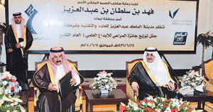 وتمنى سموه أن يشاهد بعضًا من نتائج هذه الأبحاث والإبداعات العلمية في منطقة تبوك، وذلك بالتعاون مع المؤسسات العلمية في المنطقة. كما قدَّم شكره وتقديره لمعالي رئيس المدينة الدكتور محمد السويل والقائمين على الجائزة. وحثَّ صاحب السمو الملكي الأمير فهد بن سلطان أمير منطقة تبوك الشركات الوطنية بتبني مثل هذه الجائزة التي تقدمها شركة المراعي مشكورة، كما أشاد بدور مدينة الملك عبد العزيز للعلوم والتقنية الإشرافي على الجائزة، مختتماً كلمته بتهنئة الفائزين بالجائزة، متمنياً لهم التوفيق في مسيرتهم العلمية والعملية. من جهته قدّم العضو المنتدب بشركة المراعي الأستاذ عبد الرحمن بن عبد العزيز المهنا شكره الجزيل إلى إمارة منطقة تبوك لاستضافتها حفل الجائزة. مؤكداً تطلُّع شركة المراعي لاستمرار هذه الجائزة وتطوير مجالاتها بالتعاون مع مدينة الملك عبدالعزيز للعلوم والتقنية.