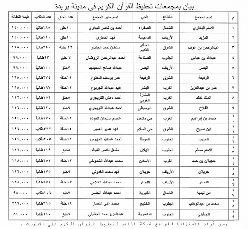 بلغ عدد الذين يرتادون الجمعية الخيرية لتحفيظ القرآن الكريم في بريدة ويستفيدون من خدماتها أكثر من (15000) طالب وطالبة في (480) حلقة نسائية.. و(350) حلقة للبنين، كما يتبع الجمعية معهد للفتيات ومعهد آخر لإعداد المعلمين من البنين ببريدة، وتحتضن قرابة عشرين مجمعاً لحق القرآن الكريم بكل أحياء مدينة بريدة برعاية ودعم ومساهمة أهل الخير والبر والإحسان في كفالة تلك المجمعات مادياً، حيث اختتمت هذه المجمعات أنشطتها وبرامجها القرآنية مؤخراً وبهذه المناسبة تحدث ل (الجزيرة) عدد من المسؤولين بالجمعية.