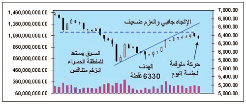 يبدو أن الإغلاق الأسبوعي جيد للمضاربة الأسبوع المقبل لكن جلسات السبت والأحد بالإضافة إلى الإربعاء ميالة لحصد ما يمكن من السيولة ومعظم المؤشرات الأساسية لم يتغير فيها شيء وما زالت سلبية، ولا ننسى أن عرض النقود في البلاد في قمته دليل خروج السيولة بشكل هادئ من سوق الأسهم، وبعد دمج حركة التداول لآخر 38 جلسة يرجح أن يغلق السوق عند 6330 نقطة فيها يتخلى عن المسار الجانبي إلى هابط.